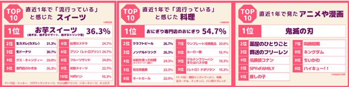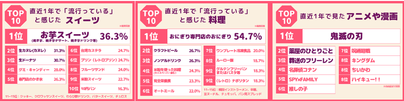 「2024年上半期50代前後の女性が選ぶトレンドランキング」とは、日本の人口の50%以上を占める(*2)50代前後の女性たちが流行していると感じる「スイーツ」、「グルメ」、「好きなアニメ・漫画」、「推し」などの関心ごとをトレンドランキング形式で調査、発表するもので、2023年より継続的におこなっているアンケート調査となります。