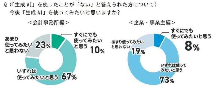 ➡会計事務所、企業・事業主ともに多くが将来的な生成AIの利用に前向きな姿勢