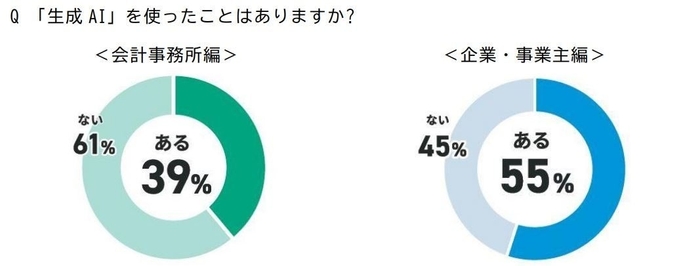 ・生成AIを使ったことがある会計事務所は39%(前回調査時37%)、生成AIを使ったことがある企業・事業主は55%(前回調査時50%)