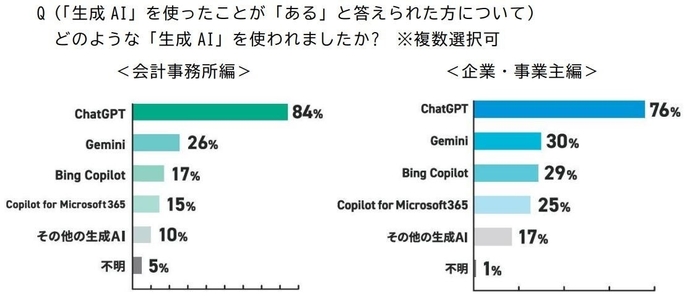 ➡会計事務所、企業・事業主ともに『ChatGPT』が最多となり、業務での活用が進んでいる