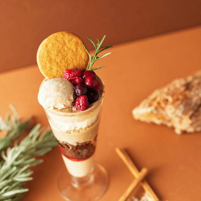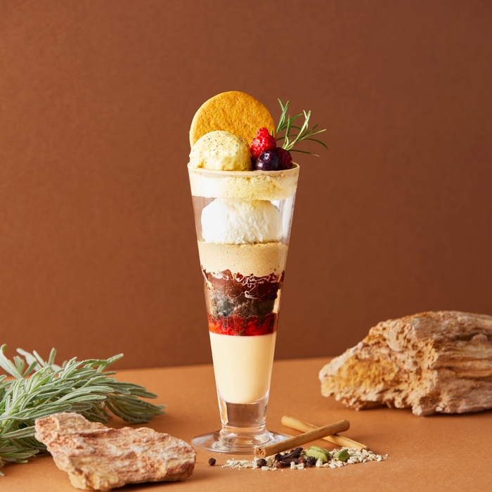 スパイス香るチャイティーパフェは、カフェのオリジナルスイーツ「ティージェラート」のアッサムチャイフレーバーをはじめ、チャイプリン、チャイゼリー、チャイホイップを組み合わせることで、最初から最後の一口までチャイを堪能できるチャイ好きにはたまらないスイーツです。トッピングのミックスベリーやパフェの中に入ったストロベリーソースの爽やかな酸味で味にアクセントをつけ、ココアクッキーで食感の変化も愉しめるこだわりパフェに仕上がっています。