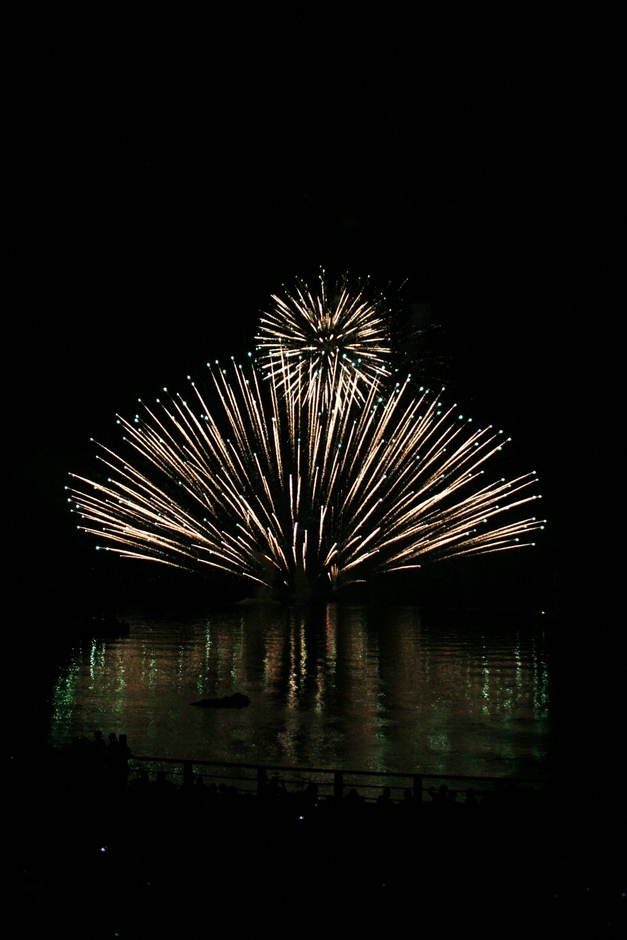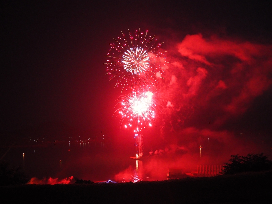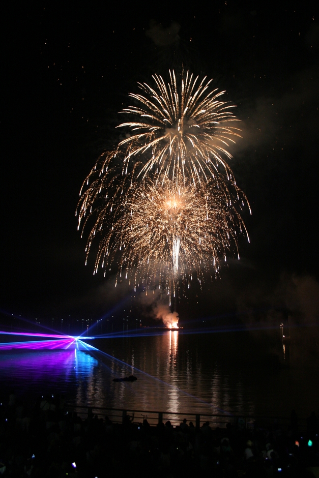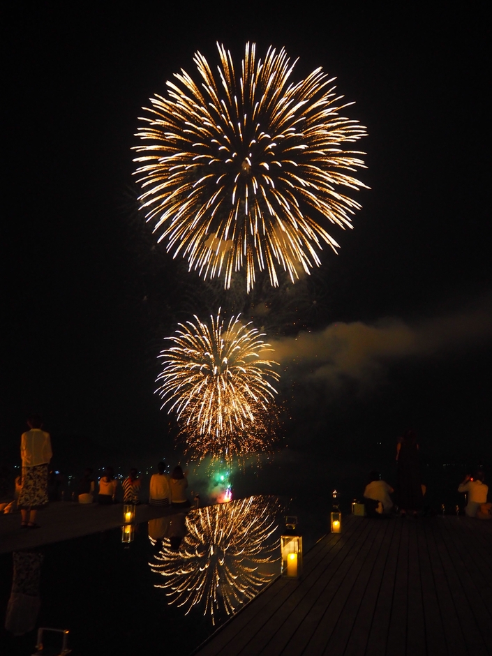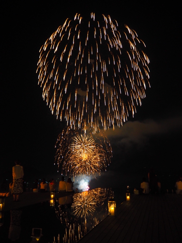 イベントの終盤、会場の灯りが暗くなり一筋のレーザービームが辺りを照らしツネイシ花火がスタート。花火とレーザービーム・音楽が連動する花火ショーは、常石造船の工場を背景に、尺玉や水中花火など演出を凝らした約20分の花火が夜空と海面を彩り、来場者を魅了しました。