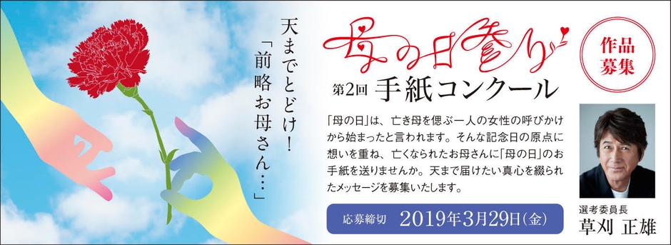 今回、新たな選考委員長への就任が発表された草刈正雄さんは1970年、男性化粧品CMでのデビュー以来、映画・ドラマ・舞台・CMに数多く出演、2016年のNHK大河ドラマ「真田丸」では“昌幸ロス”なる社会現象を惹き起こし、さらに今年4月期のNHK朝の連続ドラマ「なつぞら」への出演も控え、母を見送った世代の代表として『母の日参り』の意義を呼びかける、その社会的な発信力に大きな期待が寄せられます。