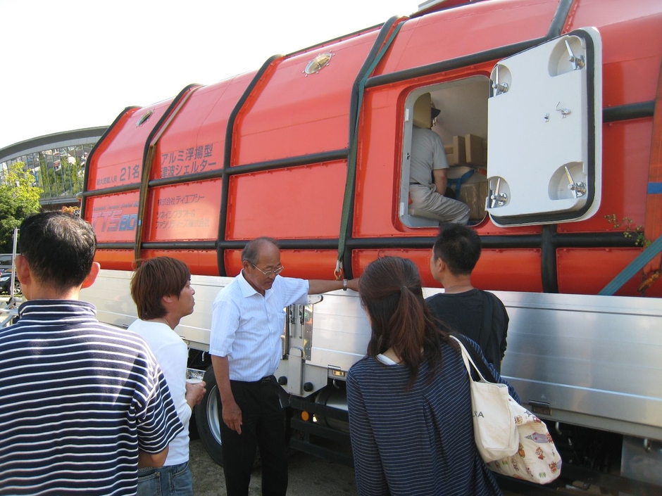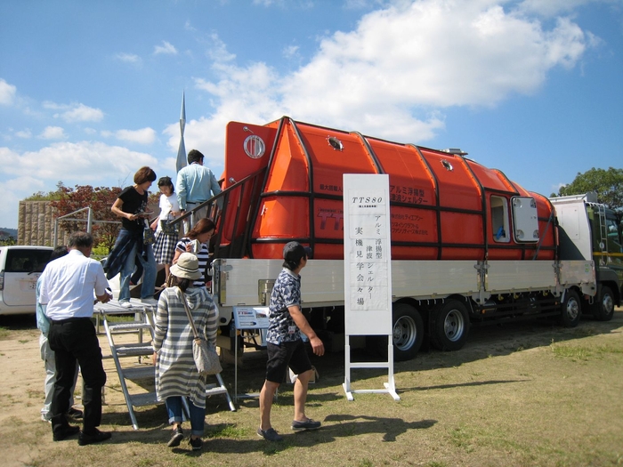 アルミ浮揚型津波シェルター「TTS80」を福山市内に展示、約700人が見学~ツネイシクラフト&ファシリティーズ
