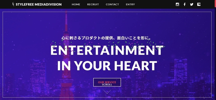2015年12月にメディア事業部を立ち上げ以来、各サービスやコンテンツの充実に伴い、事業部単体のWEBサイト公開に至りました。コンセプトは「心に刺さるプロダクトの提供、面白いことを形に」。ベースカラーは、会社のイメージカラーであるブルーと技術力の高いメンバーのイメージを融合させ、濃いブルーに仕上げました。小さな動きにこだわり、トップページの「ENTERTAINMENT」と「HEART」にカーソルを合わせると、文字が変化するアニメーションを盛り込むことで、シンプルなデザイン且つ、遊び心のあるサイトを意識しました。