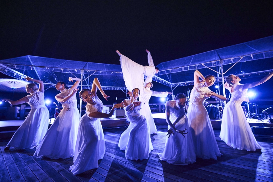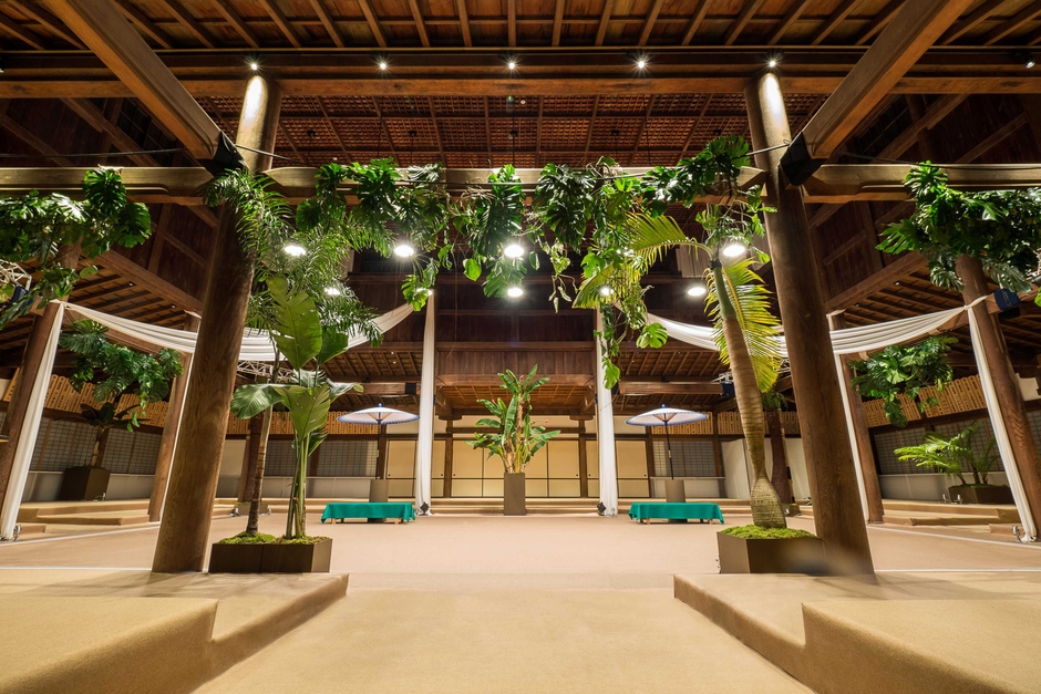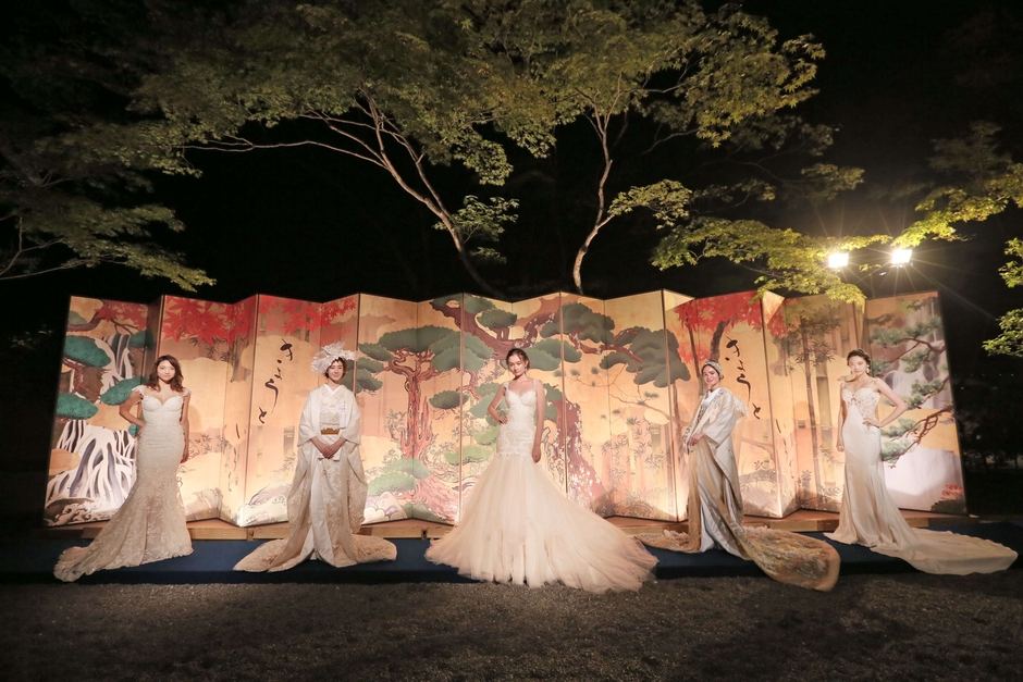 受付では長さ13メートルもの巨大な屏風が皆様をお出迎え。大護摩堂でのカクテルパーティーからスタートし、京都の街を一望できる大舞台に場所を移して、ジャズダンスカンパニー・Memorable Momentの壮大なダンスパフォーマンスをご覧いただきました。会場が幻想的な空気に包まれる中、続いてシンガー・Olivia Burrellによる祈りを込めた聲明(しょうみょう)や、越智ブラザーズのパーカッションを披露。文化と伝統を誇る京都にて、「きょうといちえ」だからこそ実現した圧巻のパフォーマンスをご堪能いただいた後には、ギター・デュオのゴンチチとモデルによる2夜限りのスペシャルコラボレーションも実現。日本の伝統美と革新的感性が融合した打掛と、格別な美しさで世界中の花嫁を魅力するGalia Lahav(ガリア・ラハヴ)のウエディングドレスが、京都の夜空の下、ギターの音色に包まれながら雅やかで華々しいステージを飾りました。