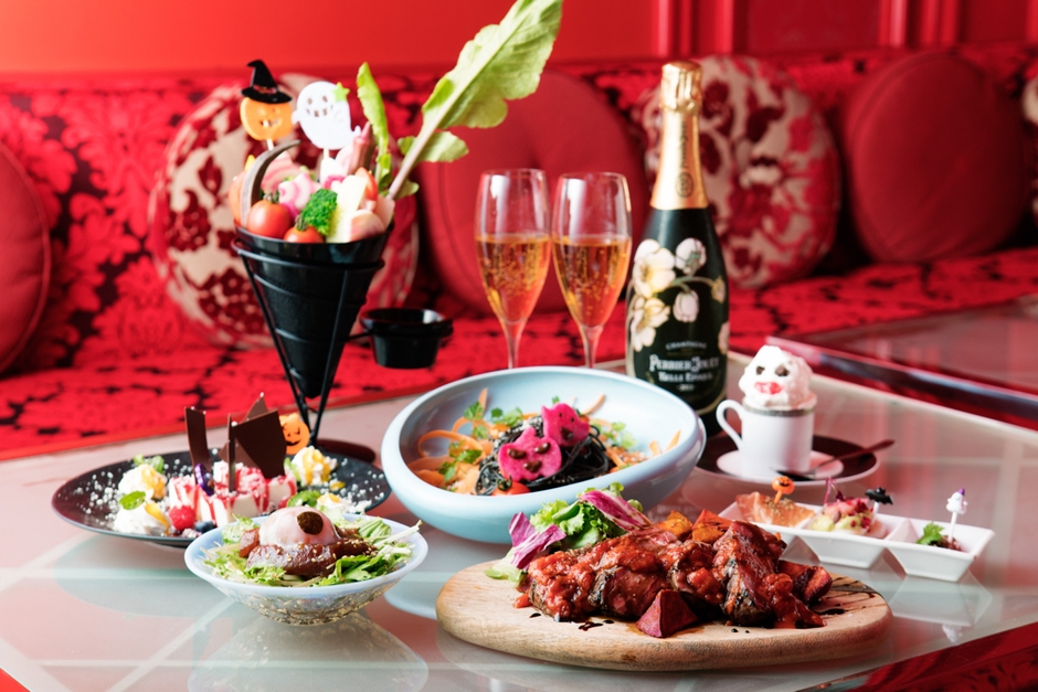 開放感あるテラス全体がハロウィンムード漂う異空間に変身するほか、「マグロのハロウィン眼球ユッケ」や「オーストラリア産フィレ肉のグリル ブラッディーアグロドルチェ風」などのインパクトある限定メニューを多数ご用意しています。さらにコースご予約の方には、ハロウィンスイーツブッフェ食べ放題をプレゼント。怪しげな雰囲気とおいしい料理で、ハロウィン気分を盛り上げます。