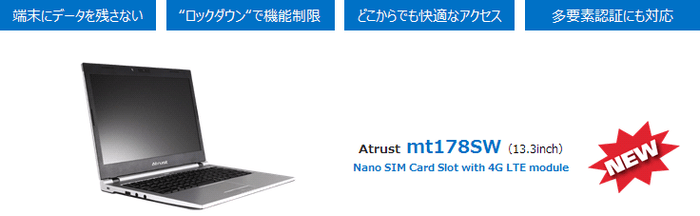 Atrust社のディストリビュータである弊社は、株式会社アクシオ様がモバイルシンクライアント「mt178」SIM対応モデルを「セキュアリモートアクセスパック」の端末ソリューションとして販売開始されることを歓迎いたします。「mt178」は端末にデータを残さず業務が可能な持ち運びしやすい軽量ノート型モバイルシンクライアントです。SIMに対応することで、さらにいつでもどこででも利用可能な端末として、