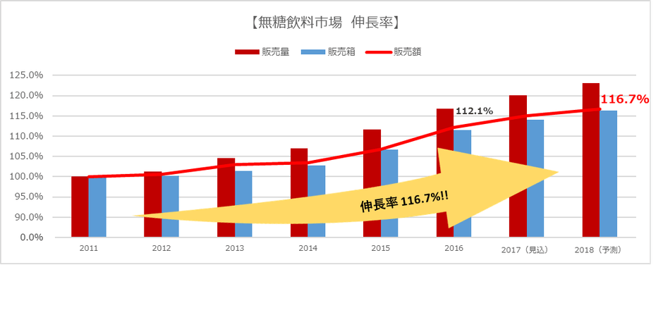 各社ミネラルウォーターブランドのラインアップ拡充により、大幅増となった。フレーバーウォーターはほのかな甘みや風味があるものの、透明色であることから、“健康によさそう”という視覚的な要素などによって消費者の需要を掴んできた。