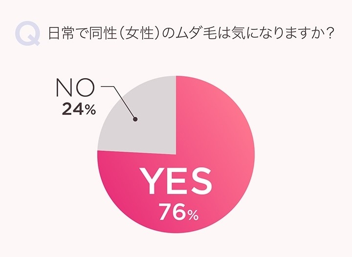「日常で同性(女性)のムダ毛は気になりますか?」というアンケートを取ったところ、なんと8割近い76%が「YES」と回答しました。どうせ女性にしか会わないからムダ毛のお手入れは適当でいいか…なんて思っていた人はドキっとしたのではないでしょうか?