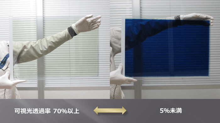 調光デバイスとは、電圧をかけることで光の透過率を変化させるもので、旅客機や自動車の窓ガラスなどに使用されています。