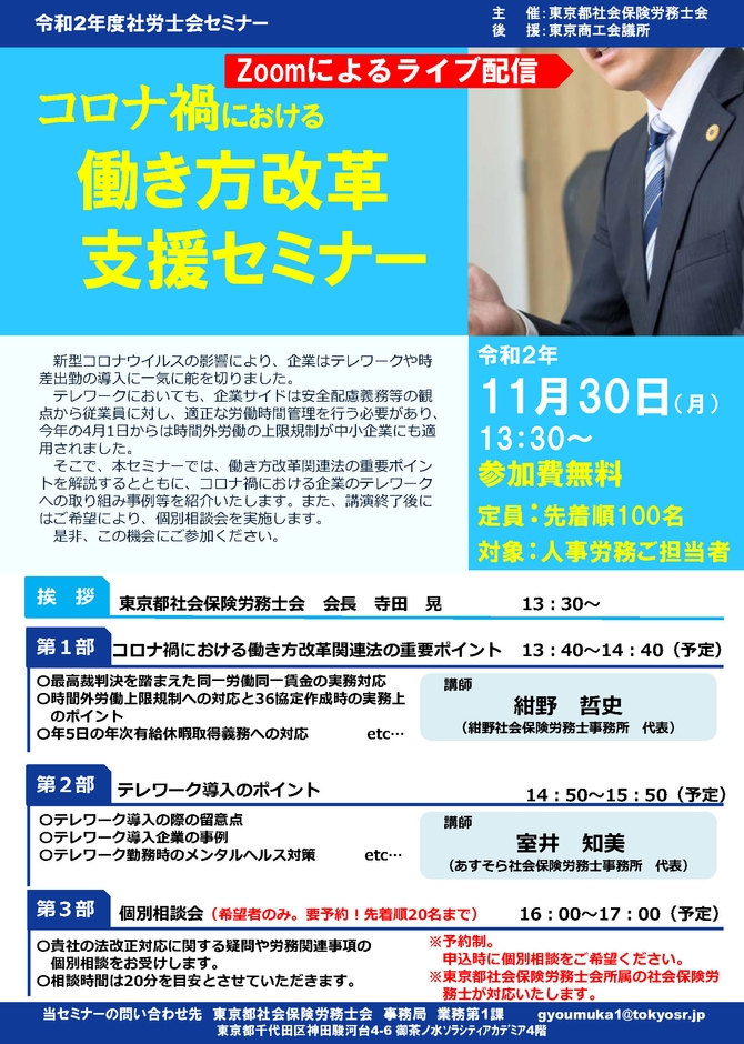 東京都社会保険労務士会(会長:寺田 晃)は、社会貢献事業の一環として、「コロナ禍における働き方改革支援」をテーマに無料セミナーを2020年11月30日(月)、オンラインで開催します。