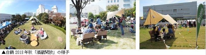 4月13日(土)開催の「白鶴2019年春『酒蔵開放』」では、(株)ロゴスコーポレーション協力のもと、芝生にタープ(※)やベンチ等の外飲みブースを用意し、屋外での日本酒の楽しみ方を提案します。