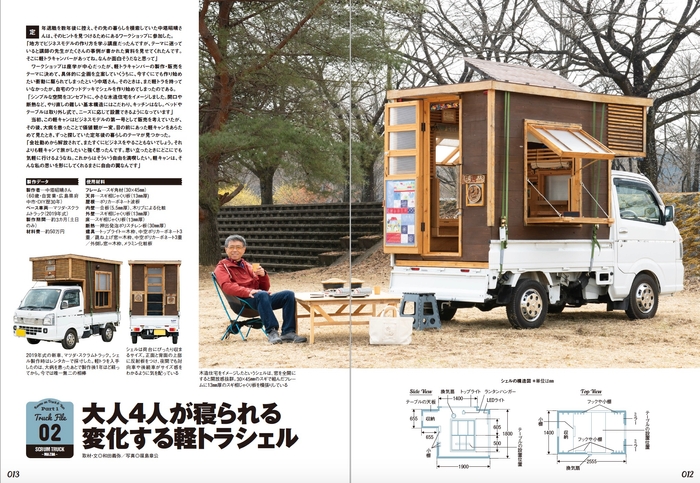 巻頭の「手作りキャンピングカー実例集」では、DIYにより車中泊仕様に変身したトラックとバンを計16台紹介。