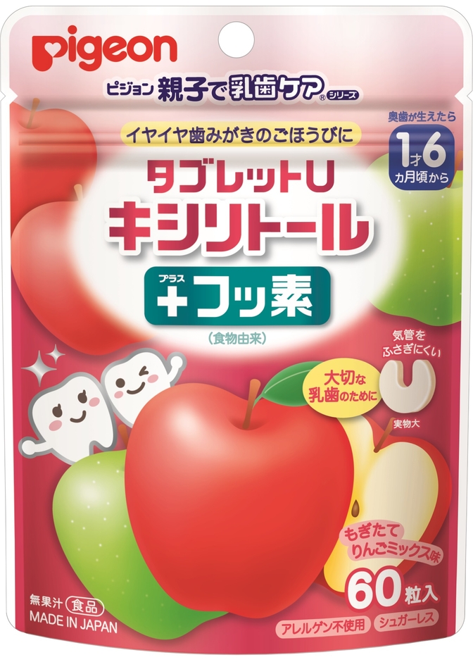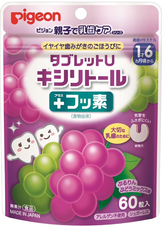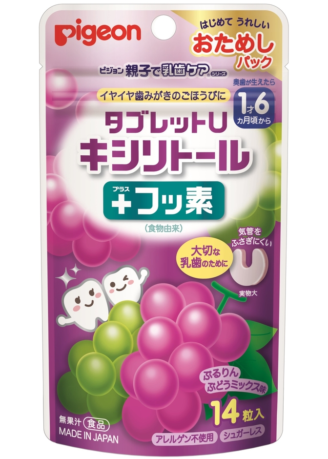 せっかく早期から乳歯ケアを始めても、それを継続しないことには歯の健康は維持できません。乳歯ケアに関するママやパパのお困りごとのひとつに「子どもが歯みがきを嫌がる」というご意見をあげる方が約50%(ピジョン調べ)と多く、歯みがきには苦労されています。毎日の歯みがき習慣は、お子さまの将来の歯の健康にとって、とても大切です。「タブレットUキシリトール+フッ素」は、お子さまが嫌がる歯みがき後のご褒美としてもお使いいただくことができ、歯みがきが苦手なお子さまの“がんばる気持ち”を応援します。味はお子さまの大好きな「りんご味」と「ぶどう味」なので、楽しくお召しあがりいただき、継続してご使用いただけます。