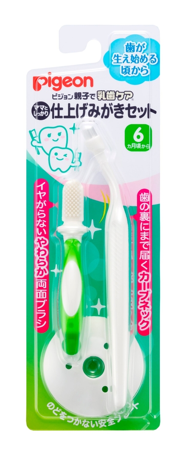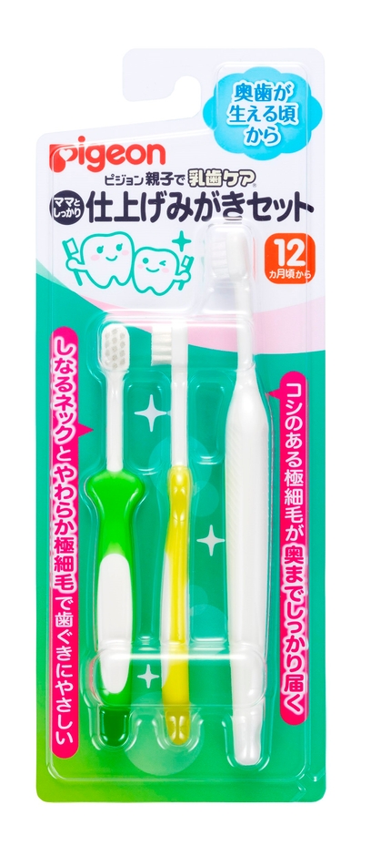 本商品は、6ヶ月、12ヶ月頃からの赤ちゃん用の「乳歯ブラシ」と、大人が仕上げみがきをしてあげる際に使用する「仕上げ専用歯ブラシ」をセットにし、早期から赤ちゃんの「自分みがき」と大人による「仕上げみがき」をセットで、乳歯ケアのスタートが出来るようにしました。
