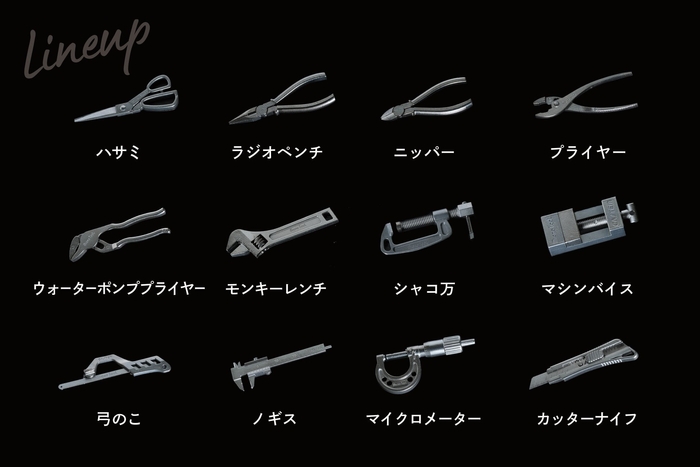 12種類のミニ工具のラインナップは「ハサミ」「ラジオペンチ」「ニッパー」「プライヤー」「ウォーターポンププライヤー」「モンキーレンチ」「シャコ万」「マシンバイス」「弓のこ」「ノギス」「マイクロメーター」「カッターナイフ」となります。