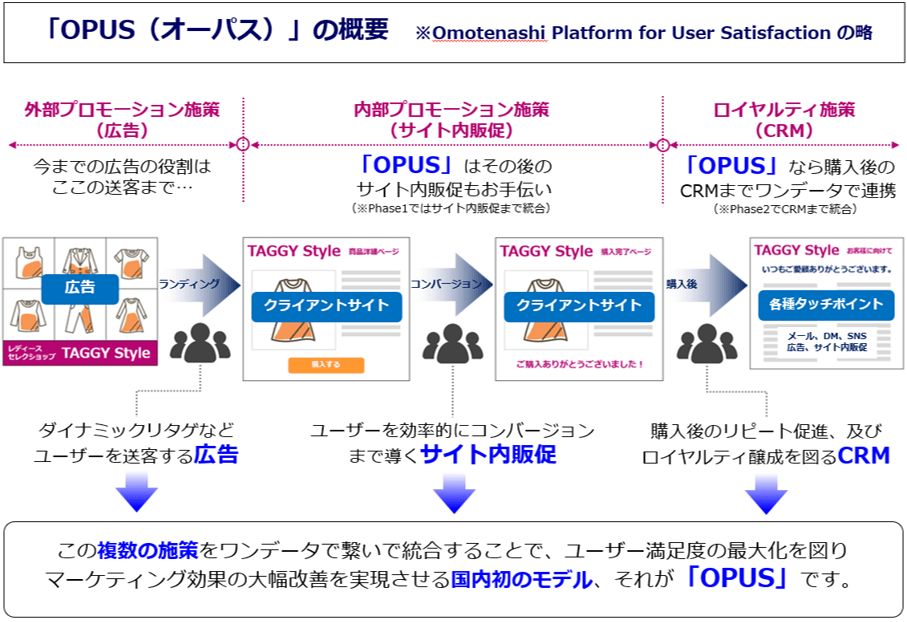 株式会社TAGGY(東京都港区、代表取締役社長:石上 裕、以下 TAGGY)は、株式会社ブレインパッド(東京都港区、代表取締役社長:草野 隆史、以下 ブレインパッド)と共同で、インターネット広告、サイト内プロモーション、および購入後のCRMまでをワンデータで統合する国内初(当社調べ)のマーケティングサービス「OPUS(オーパス)」を開発し、本日より提供開始しました。(※OPUSはOmotenashi Platform for User Satisfaction の略)