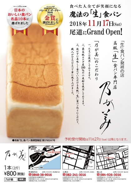 “パン・オブ・ザ・イヤー”金賞の高級「生」食パン専門店 『乃が美 はなれ 尾道販売店』が11月17日(土)オープン