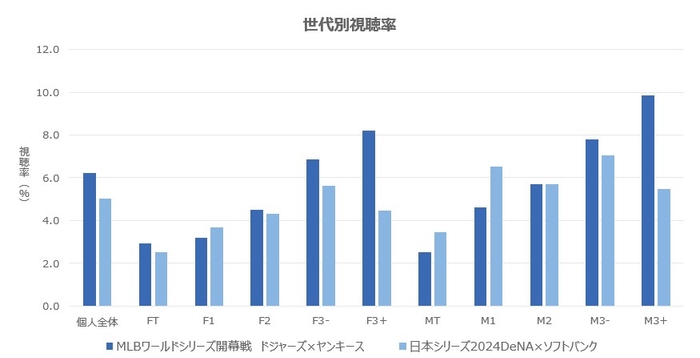 年齢が高くなるにつれ、MLBワールドシリーズの視聴率が高くなり、対して男性若年層(MT、M1)は日本シリーズの方が視聴率が高い傾向となっていました。これはMLBワールドシリーズが朝から放送開始しているのに対し、日本シリーズは夕方から放送開始という放送時間帯にも関連している可能性が考えられます。