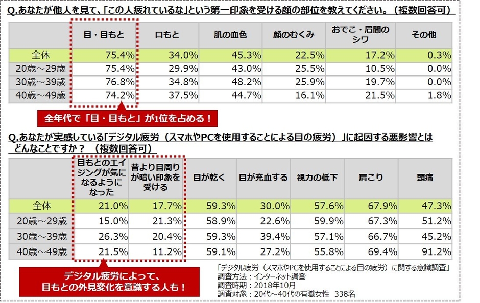また、同調査で他人を見て「疲れているな」という第一印象を受ける顔の部位については、約75.4%が「目・目もと」から判断しているという結果も。目は人の気持ちが最も現れやすいパーツだからこそ、目の充血や目もとのシワ・ハリのなさ・暗さは相手へのネガティブな印象に繋がってしまうのかもしれません。