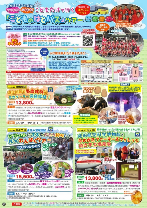 引率で子どもたちに冒険と発見と笑顔を届ける株式会社引率舎(本社:東京都葛飾区、代表取締役:岸 幸成、以下 引率舎)は、引率業務のタイアップで2018年の夏休みも「こどものはとバス」に引率業務を提供いたします。今回は「成田航空科学博物館となめがたファーマーズヴィレッジ焼き芋工場見学」「富士山麓で酪農体験&天然クーラー洞窟体験」「カブトムシにマスにぶどう狩りも♪秩父わんぱくツアー」の3つの日帰りプランとなります。
