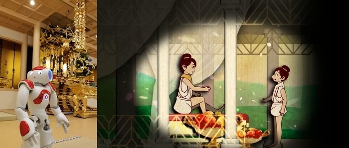 今回は親子で楽しんでいただけるよう、ストーリー仕立ての法話(お説教)を映像にしました。約15分間の上映後には、IT住職こと大洞住職によるお話や、部下のロボットたちとゲームを通じて触れあっていただけるコーナー(※)もご用意しています。