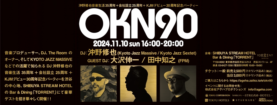 OKN90実行委員会は、世界で活躍するDJ・作曲家の沖野修也氏の音楽活動35周年に加え、沖野氏が代表を務めるアーティストマネジメントやクラブ運営を行う有限会社エクストラ・フリーダムの設立25周年、沖野修也と沖野好洋による兄弟DJユニット「KYOTO JAZZ MASSIVE」のデビュー30周年を記念したスペシャルパーティー「OKN90」を11月10日(日)、SHIBUYA STREAM HOTELの4階にあるBar & Dining「TORRENT(トレント)」にて開催します。