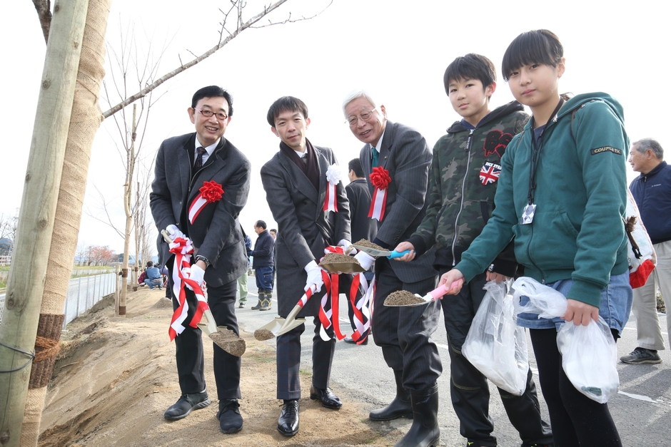 気温8度と、12月初旬としては低い気温の中、40本のソメイヨシノを植樹。朝倉東小学校の皆さまには、水溶性の特殊紙に夢を書いていただき、苗木と共に土へ納め、桜の成長と夢の成就も祈念いたしました。皆さまの素敵な夢が桜と共に美しく咲き誇り、蘇った桜並木が朝倉市の皆さまの心を癒し、支える日が一日も早く訪れるよう、アディーレの職員一同、心から願うものであります。