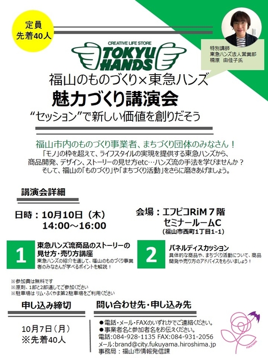 福山市(広島県)で,福山市都市ブランド戦略推進協議会(事務局:福山市情報発信課)が10月10日(木)にエフピコRiM7階セミナールームCで,市内のものづくり事業者やまちづくり団体を対象とした「福山のものづくり×東急ハンズ 魅力づくり講演会」を開催しました。