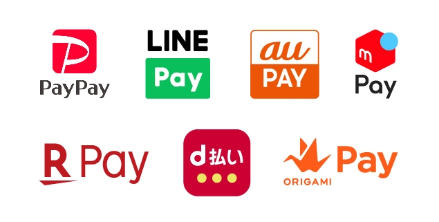 PayPay、LINE Pay、au PAY、メルペイ、楽天ペイ(アプリ決済)、d払い(R)、Origami Pay