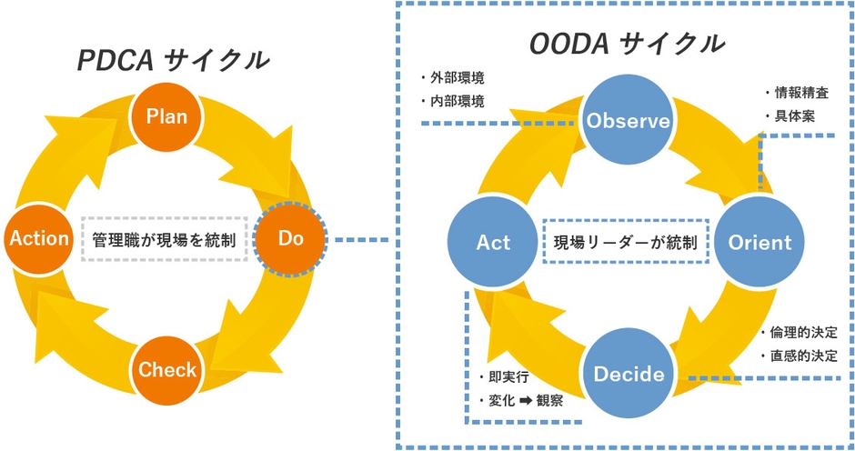PDCAに対してOODAは、環境変化に柔軟に対応する新たなマネジメントと言われています。PDCAにおける"Do"の結果が全て出るまで待つことなく、次の"Action"を行うことも可能です。