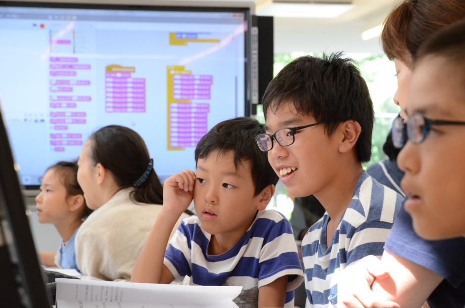 スクールではプログラミングの基礎を学ぶソフト「スクラッチ」を使用。基礎編では、参加者はパソコンの扱い方からキャラクターの動かし方まで、講師や学生メンターから分かりやすく指導を受けました。基礎編終了者を対象にした応用編は、でき上がったキャラクターで簡単なゲームを作るなどレベルアップした内容で、参加者はプログラミングの魅力を再認識していました。