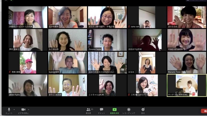 当社の「ハッピートーク(R)オンライン朝礼」は緊急事態宣言発令後、社会に元気とハッピーを届けるために毎朝8:30より15分間オンライン会議システムZoomで始まりました。現在まで延べ1,818人の方に参加していただき、「やる気になった!」「一日が元気に過ごせた」「テレワーク中でもメリハリができた!」などの感想をいただき、幸福度も通常より30%以上upの結果が出ております。