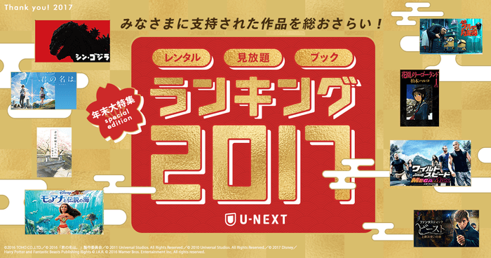 株式会社 U-NEXT(本社:東京都渋谷区、代表取締役社長:堤 天心)が運営する、日本最大級の映像配信サービス「U-NEXT(https://video.unext.jp)」は、2017年12月22日(金)、2017年度の年間ランキングを発表いたしました。