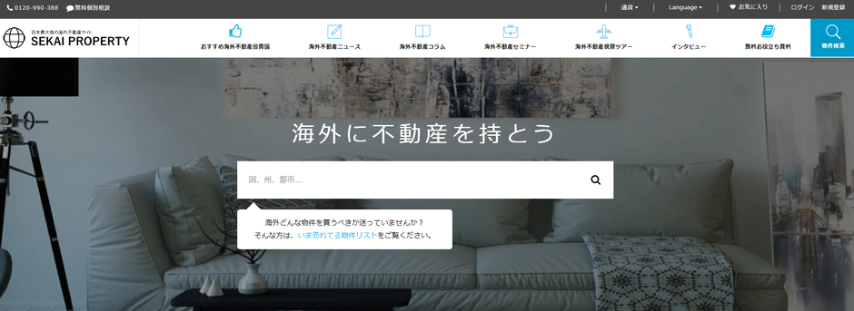 セカイプロパティ(SEKAIPROPERTY)は誰でも簡単に世界中の不動産情報の検索が可能で、自分にあった不動産を見つける事ができるポータルサイトです。