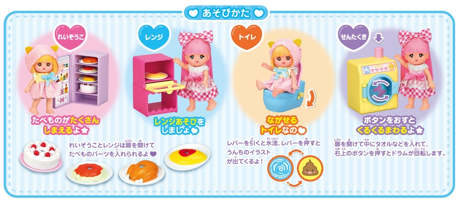 洗濯機はボタンを押すとドラムがくるくると回転します。トイレは、レバーを引くと水流、レバーを押すとうんちのイラストが出ます。本物そっくりの家具セットで、ポケットメルちゃんとたくさん遊んでみてください。