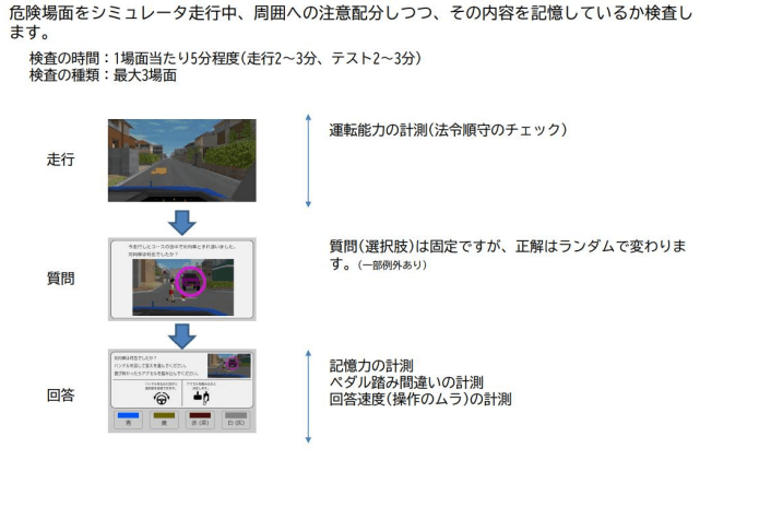 シミュレーション走行中に見ていた映像(対向車の色や、標識の内容等)について短期記憶力の計測を行います。