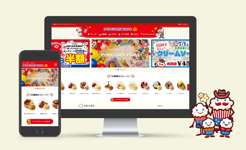 また、「ポップコーンパパ」のキャラクターを随所に使用し、可愛らしくポップなデザイントーンに仕上げております。
