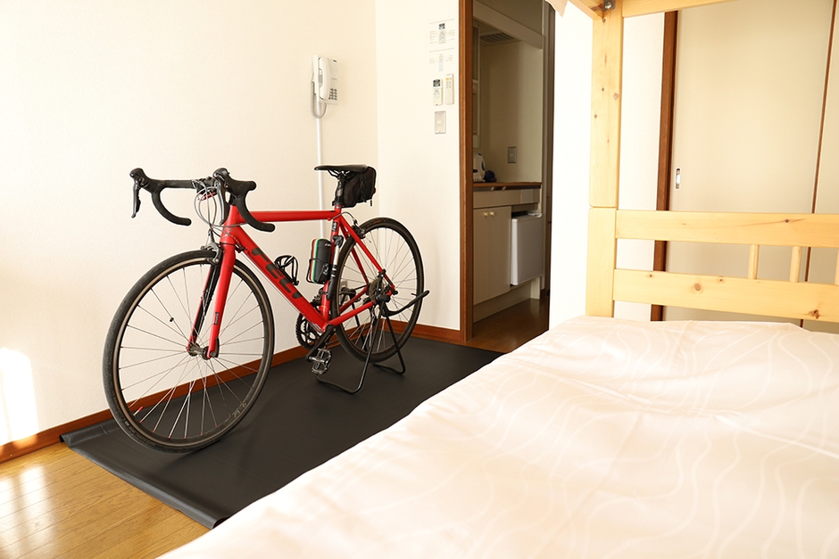 現在は2部屋のみ限定の宿泊プランとなっており、1部屋は自転車2台を上下に収納できる2段ラックを完備し、もう1部屋は床に置ける専用スタンドを貸し出しております。