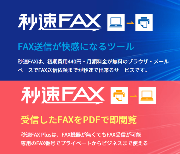 「秒速FAX」は、オフィスや出張先、自宅など、どこからでもFAXを送受信できるサービスです。紙ベースの書類をクラウド上で管理し、必要に応じて印刷することで、ペーパーレス化にも貢献します。また「秒速FAX」は送信、「秒速FAXPlus」の受信のそれぞれのサービスに分かれているため、使用用途により選択が可能です。