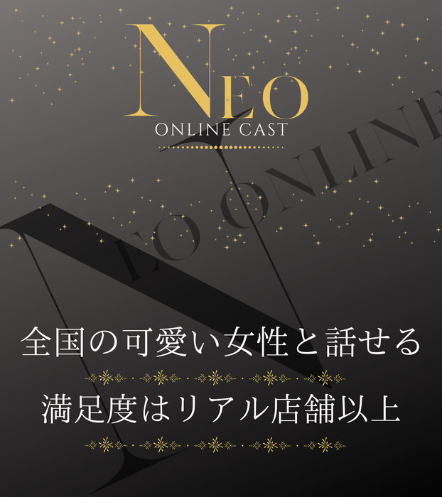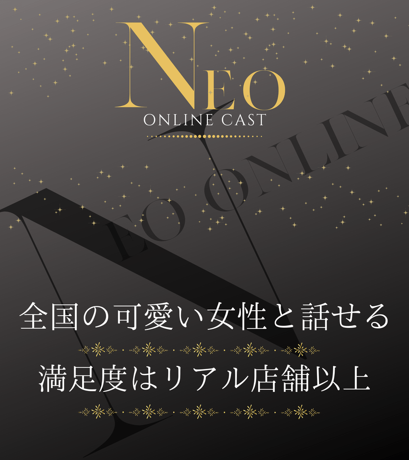 オンライン専門でZOOMなどのビデオチャットを使って自宅にいながらスマホ、タブレット、PCなどを使い全国の可愛い女性達と気軽にお話ができます。 NEOの最大の特徴は全国のキャバクラ嬢、クラブ・ラウンジコンパニオン、モデル、素人の女の子など様々なキャストが在籍しております。年齢も20代~30代半ばの可愛い系から大人の女性、会話が面白い女の子まで幅広く在籍しておりますので、オンラインの世界でもお客様を飽きさせることはありません。そんなNEOだからこそあなたにピッタリの女性をきっと見つけられます。