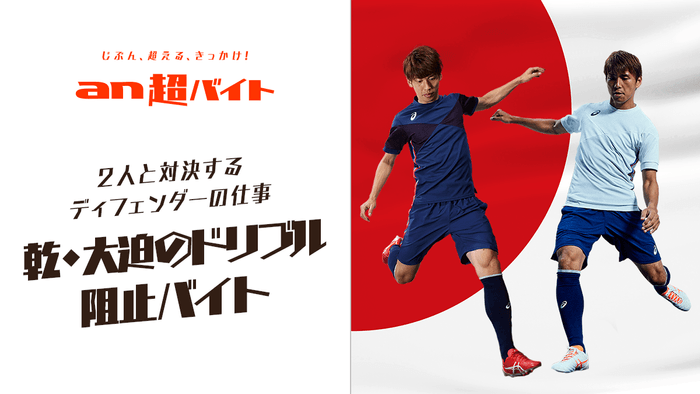 総合人材サービス、パーソルグループのパーソルキャリア株式会社(旧社名:インテリジェンス、本社:東京都千代田区、代表取締役社長:峯尾太郎)が運営するアルバイト求人情報サービス「an」< https://weban.jp/ >は、思わず挑戦してみたくなるような「an超バイト」の新企画として、スポーツメーカー「アシックス」の新シューズ「DS LIGHT X-FLY」の発売を記念して行われる2on2イベントで、乾貴士選手、大迫勇也選手と対決する“ドリブル阻止バイト”を2名募集します。報酬は、日給5万円に加えて、見事ドリブルを阻止できた場合はインセンティブとして1万円追加で支給。さらにサイン入りグッズもプレゼントします。