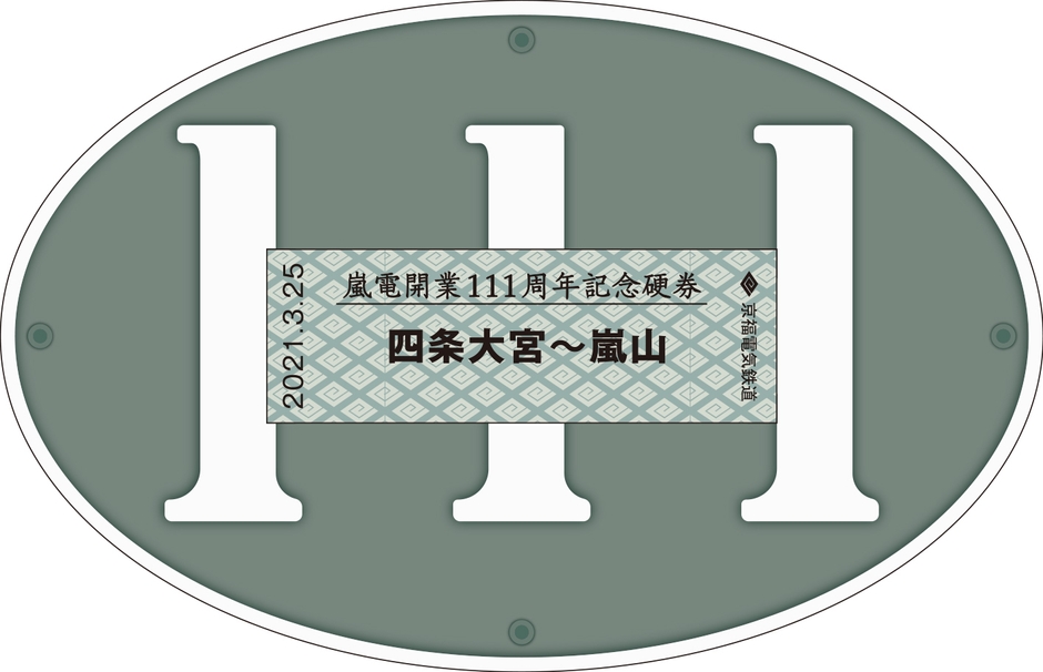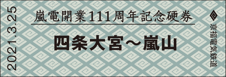 京福電気鉄道株式会社(本社:京都市中京区、社長:大塚憲郎)では、2021年3月25日(木)に嵐電が開業111周年を迎えます。昨年は開業110周年の記念の年でしたが、新型コロナウイルスの感染拡大で、イベントなども軒並み中止となりました。新型コロナウイルスの先行きはまだ見通せない状況ですが、早期の収束を祈念しつつ、開業記念日の3月25日(木)より、「嵐電開業111周年記念硬券」を発売、また、同じく2020年に110周年を迎えた株式会社不二家(本社:東京都、社長:河村宣行)とのコラボレーションにより運行している「あらん&ペコちゃん」ラッピング電車を、111周年記念電車として引き続き運行します。