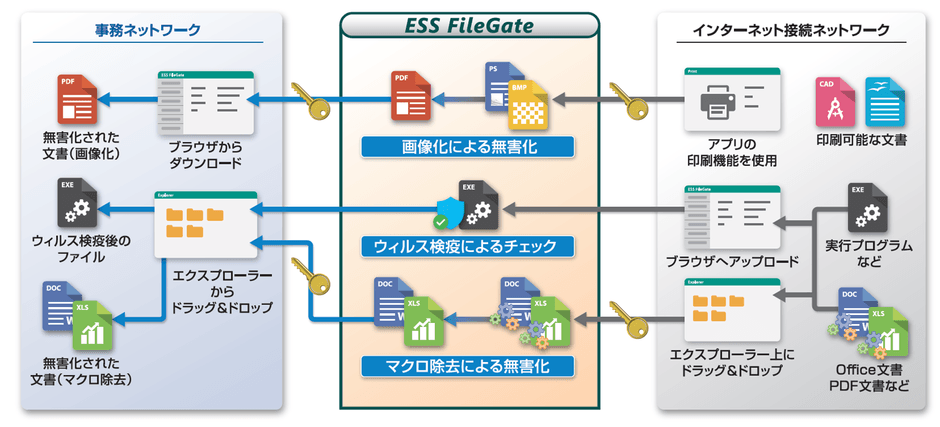 「ESS FileGate」は、組織内の分離されたネットワーク間で安全にファイルの受け渡しを実現するファイル無害化ソリューションです。地方自治体や教育機関、金融機関をはじめ、サイバー攻撃対策の一環でネットワークを論理分離している環境や機密性の高い情報を保持するサーバーからのファイル持ち出し等においてご利用いただいています。