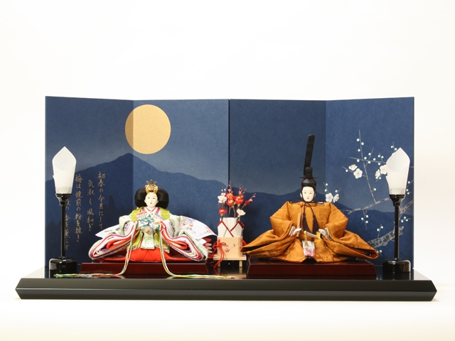 屏風には元号「令和」のゆかりの地とされる福岡県太宰府にある坂本八幡宮の宵節句をイメージした四王寺山、梅花の歌、梅と月を描きました。また、お飾りにも太宰府の象徴である紅白の梅の飾りを配しています。