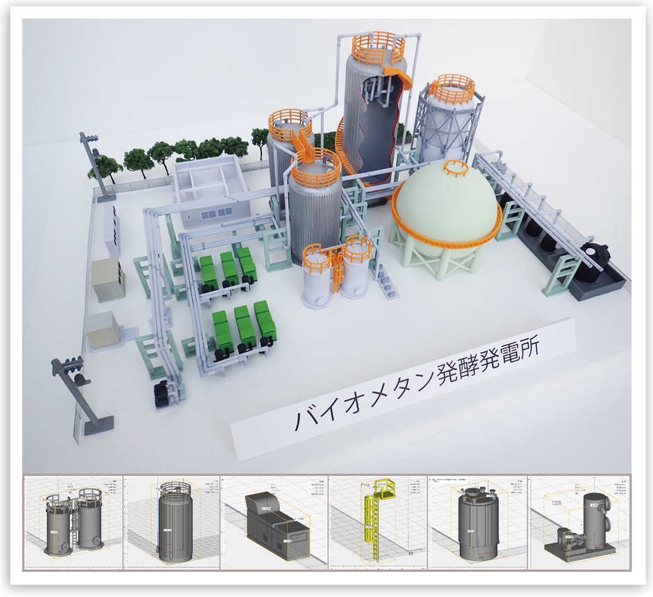 3DCAD、3Dプリンターを活用することで、プラントの装置群、配管ルート、建屋等の製造・処理フローを立体的に視覚化することが可能となりました。設計図面から3Dデータを作成し、3Dプリンターに出力することで、速やかな設計支援とデザインプロセスを一貫体制で行います。