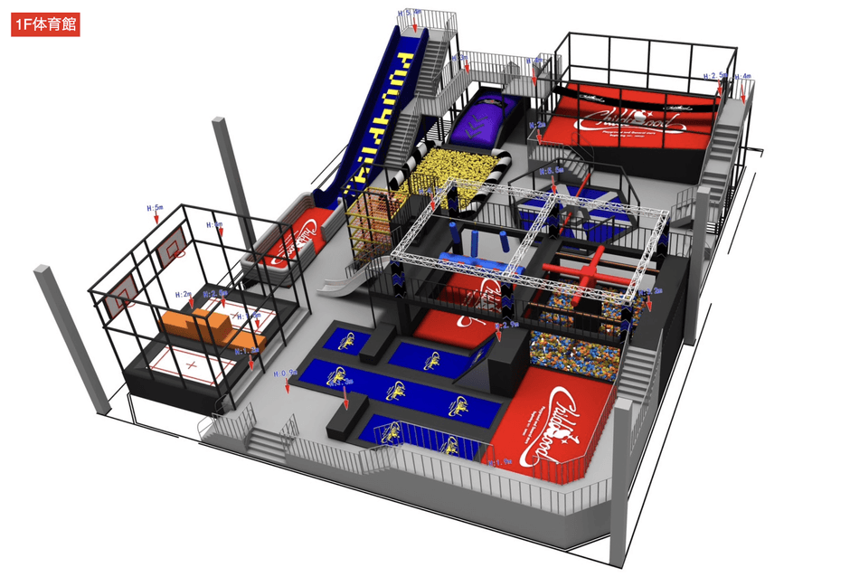 720平方メートルの旧体育館に導入するアトラクションは、ほぼ全てが北海道初のアトラクションです。5種のトランポリンを中心とした様々なアトラクションがあり、さまざまな障害物をアクションゲームのようにクリアしていく巨大フィールドアスレチック。
