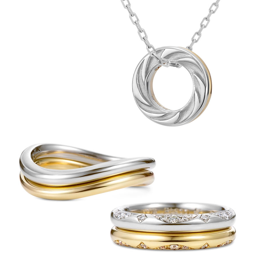 【お客様ストーリー】 “成長の記録にもなるようなベビーリングが欲しい” そんな想いから、生後3か月の赤ちゃんの指を糸で測り、その寸法でオーダーしました。「家族ならではの特別なものがいいから、結婚指輪とお揃いにしたい。」というイメージをカタチにした、親子おそろいリング。片面にはパパの指輪のモチーフ“風”をイメージしたデザインを。もう片面にはママの指輪のモチーフである“花”をデザインして…。まるでパパとママの指輪がひとつになったような、2色使いのベビーリングが完成しました。