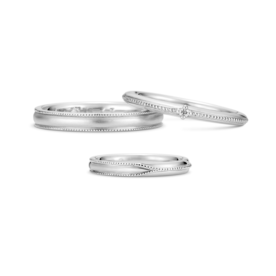 【お客様ストーリー】 パパとママは、シンプルなストレートラインに丸い粒の『ミル打ち』が一周続く結婚指輪。パパは上下のフチに、ママは中央に『ミル打ち』がデザインされています。そんなふたりの指輪をひとつにしたようなベビーリングを、赤ちゃんへの贈り物に。生まれてきてくれた感謝の気持ちと、絆の証として…。